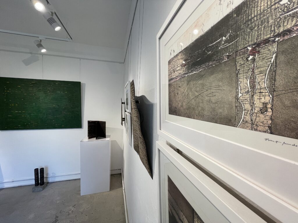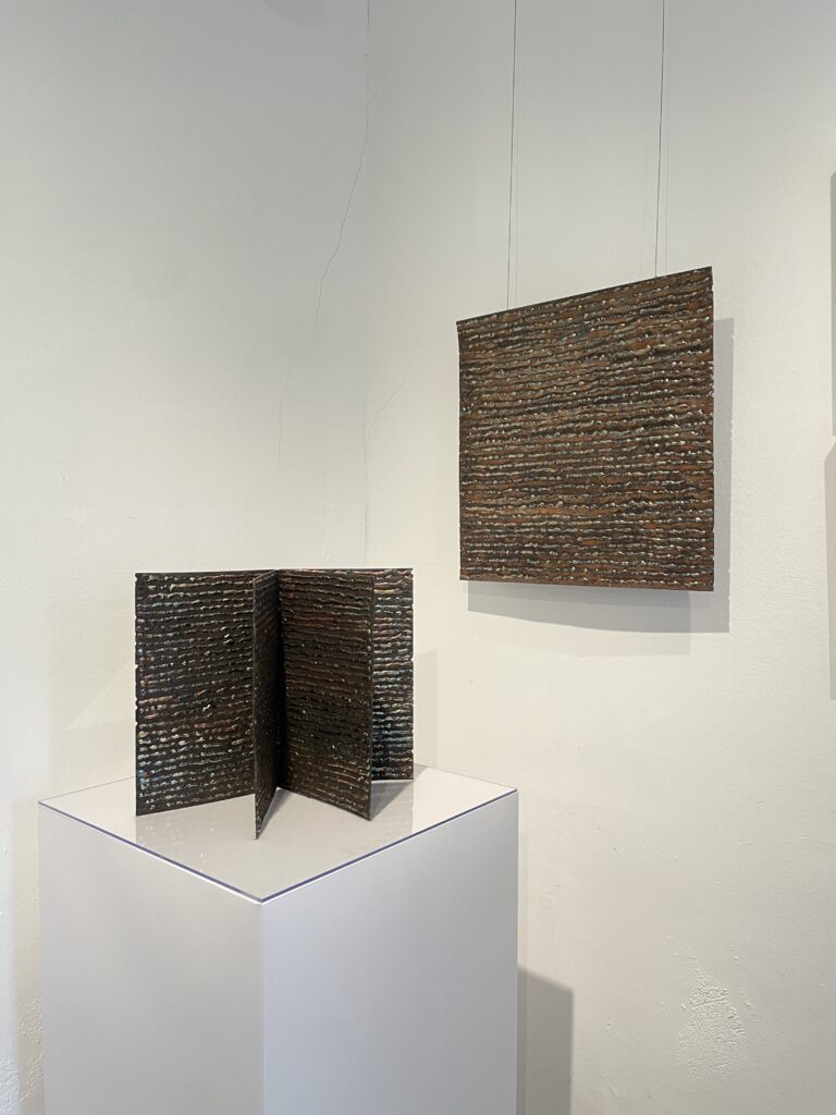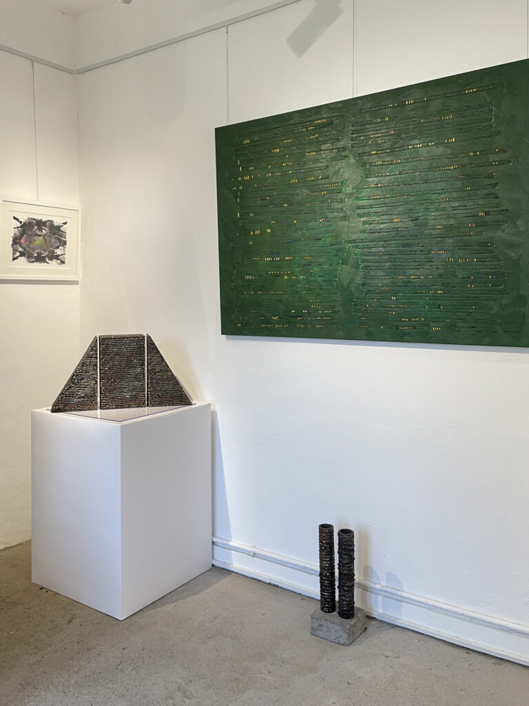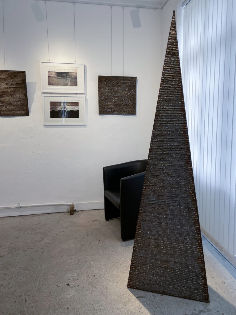 Die Anmutung von Schrift ist verbindendes Glied zwischen den Stahlobjekten und Reliefs von Wulf Kirschner und den grafischen Werken von Franz Neudeck. Die klaren industriell anmutenden geometrischen Körper von Kirschner mit geschweißten Texturen begegnen den feinen tiefschwarzen Linien, Strukturen und Formen die Neudeck auf zufällige oft fotografische Vorlagen gezielt setzt. Im Zusammenspiel wirken die Werke in sich ruhend, verbunden mit einem Hauch von Unendlichkeit, laden zur Meditation und poetischen Reflektion über Himmel und Erde, Naturgewalten und Stabilität ein.